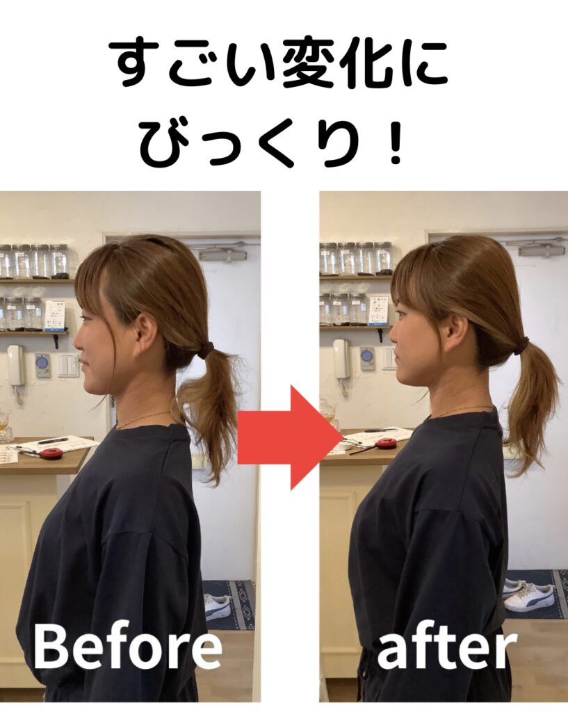 猫背で前に出ていた肩が本来の位置に戻ることで、首が長く、フェイスラインも連動して引き締まります。厚ぼったい印象がなくなり、キリッとした清潔感のある胸元、肩周りを手に入れられます。
