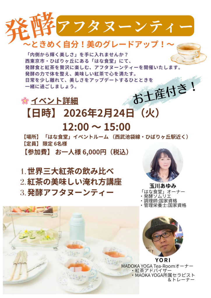 #発酵アフタヌーンティー #アフタヌーンティー #ヌン活 #発酵食 #腸活 #インナービューティー #美容食 #紅茶のある暮らし #紅茶ポリフェノール #紅茶講座 #ひばりヶ丘 #ひばりヶ丘グルメ #西東京市 #西武池袋線グルメ #はな食堂 #玉川あゆみ #MADOKAYOGATearoom #自分磨き #自分へのご褒美 #大人の習い事 #酒粕パック #甘酒ビネガー #ときめき #癒やしの時間