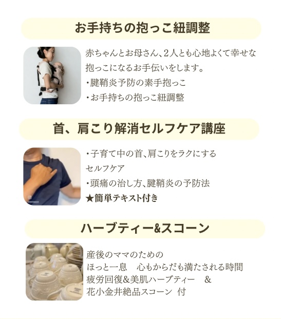 - 疲労回復&美肌ハーブティー:産後ママに嬉しいブレンドティーで内側からケア。